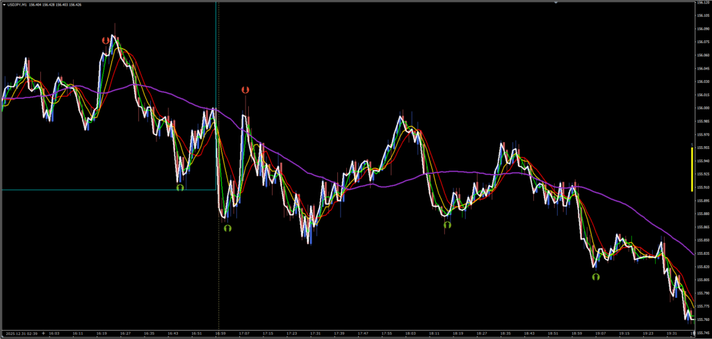 リペイントしないため、過去検証をする際も「この矢印が出た時の値動きはどう反応したか?」という正しい「答え合わせ」が可能です。 負けサインを隠さないからこそ、その「壁」の精度が信頼できるのです。