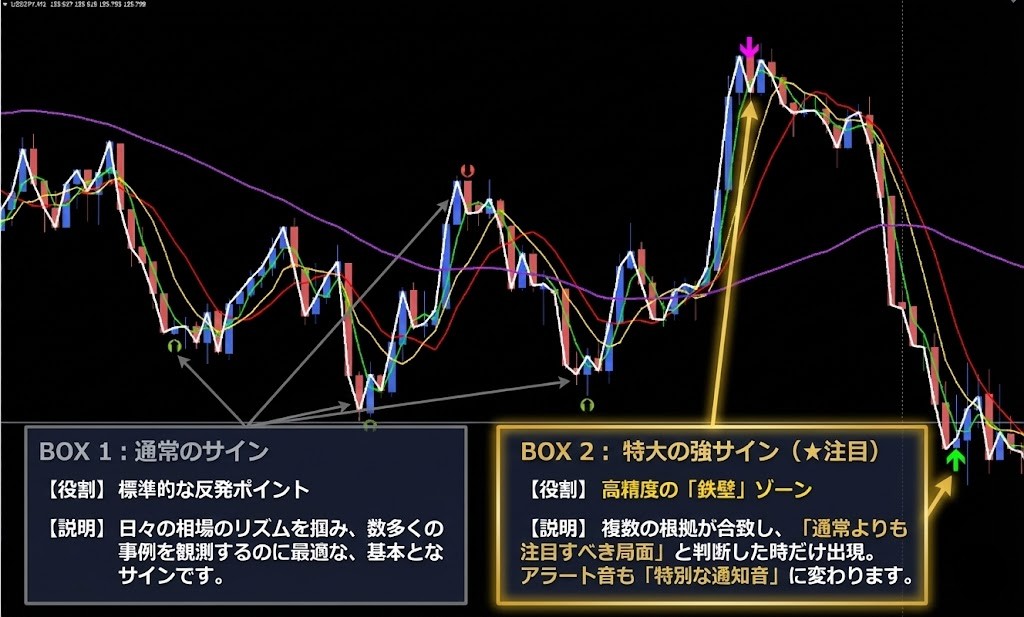 さらに、本ツールには通常の「壁」だけでなく、複数の根拠が重なった時にだけ出現する「強・特大サイン(鉄壁)」も標準搭載されています。
