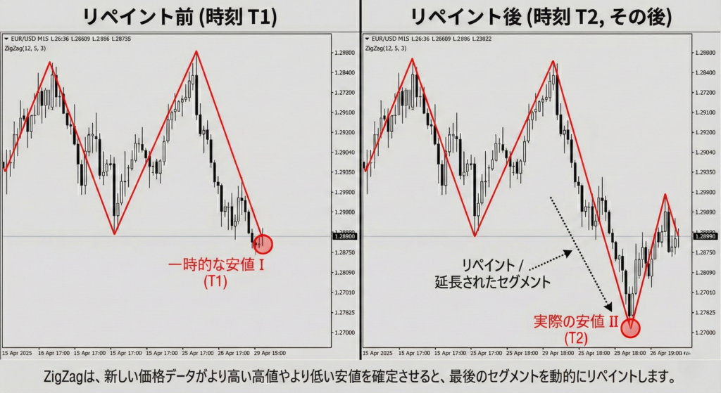 通常、ZigZagのような「相場の頂点(天底)」を表示するツールは、高値更新のたびに矢印が移動(リペイント)するのが業界の常識です。